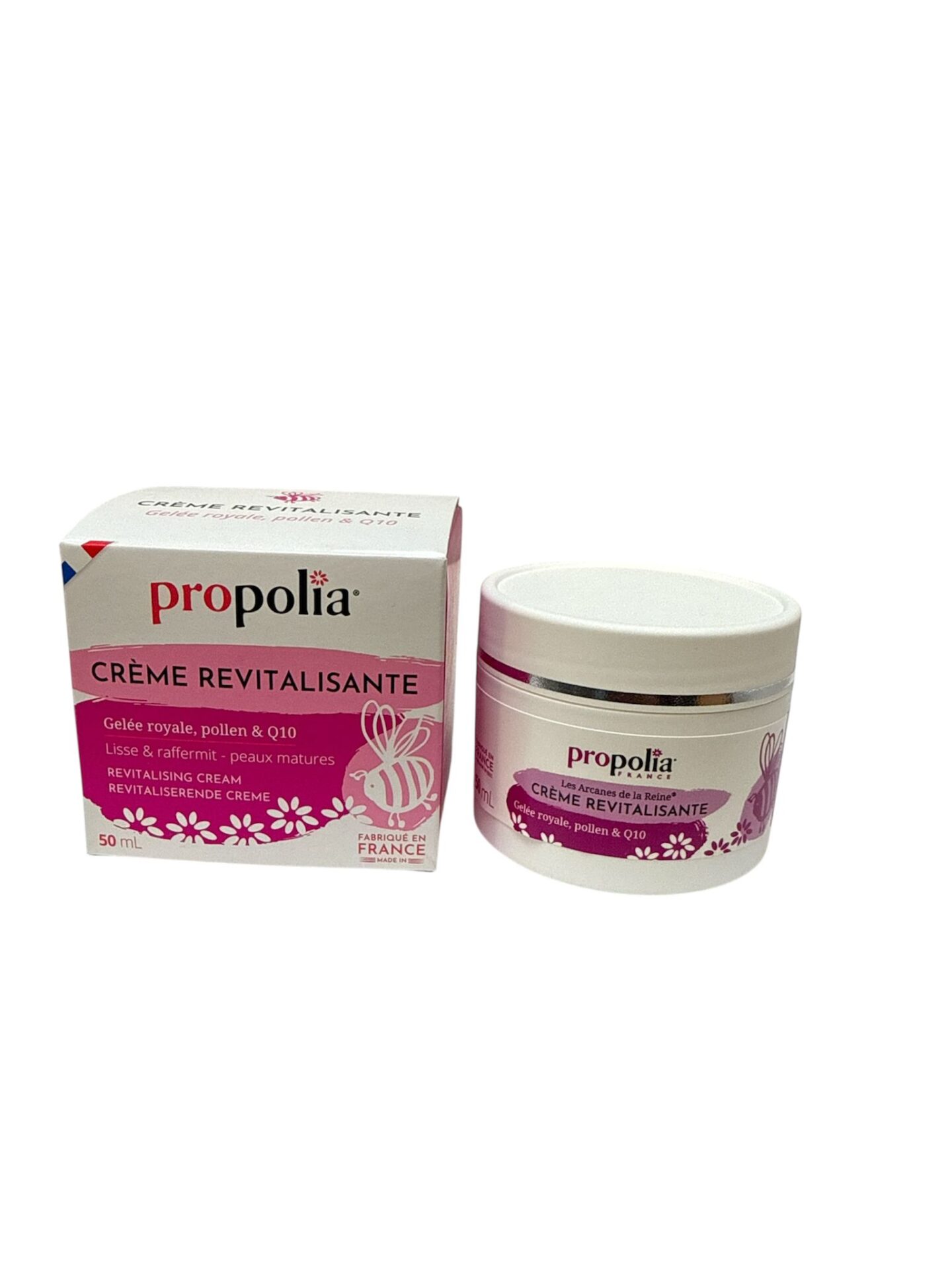 Principaux actifs: gelée royale, pollen, huile de pépins de raisins, huile d’amande douce, cire d’abeille, silicium organique , complexe co-enzyme Q10, squalane, vitamine E, Actifs anti-rides