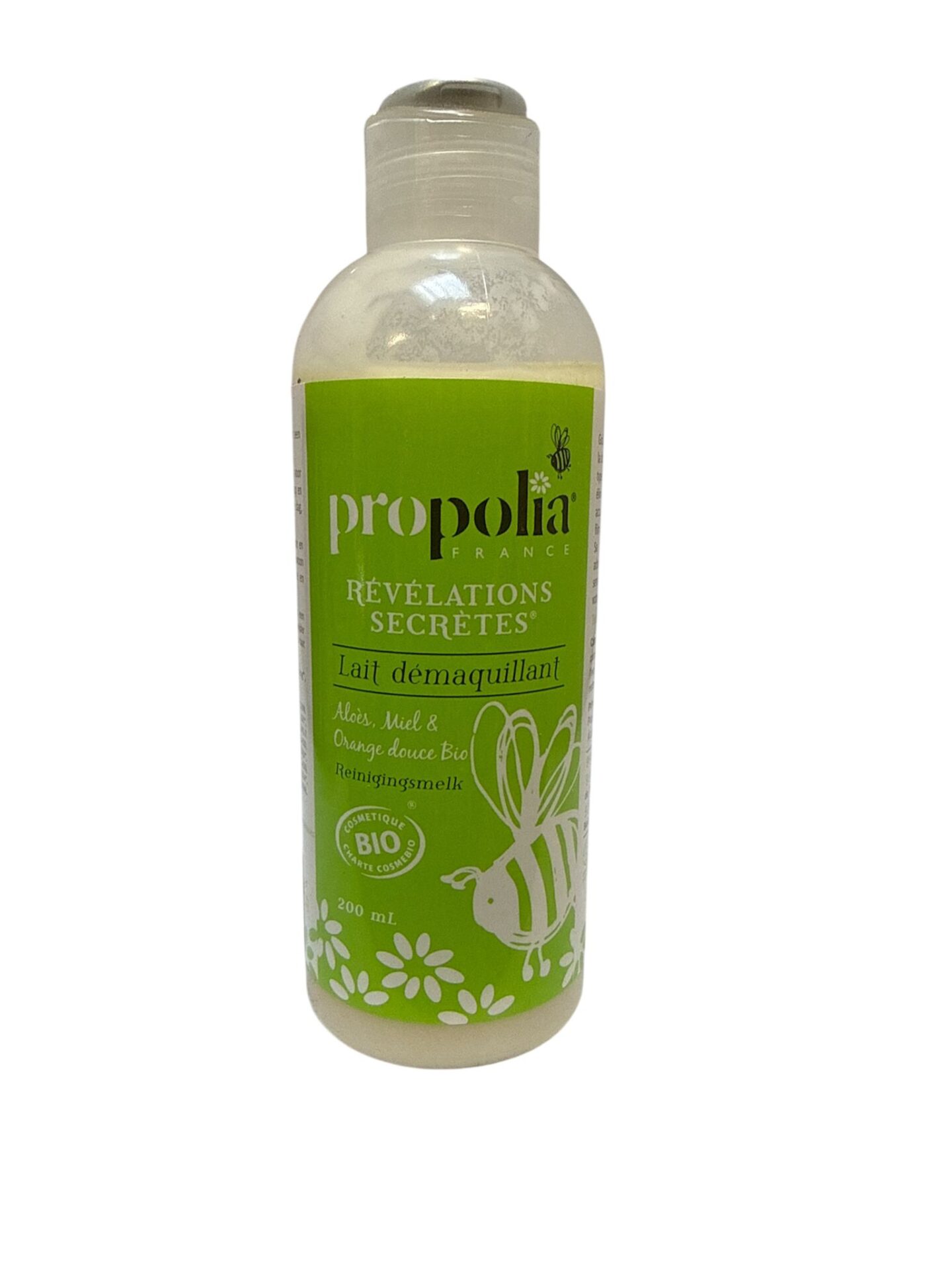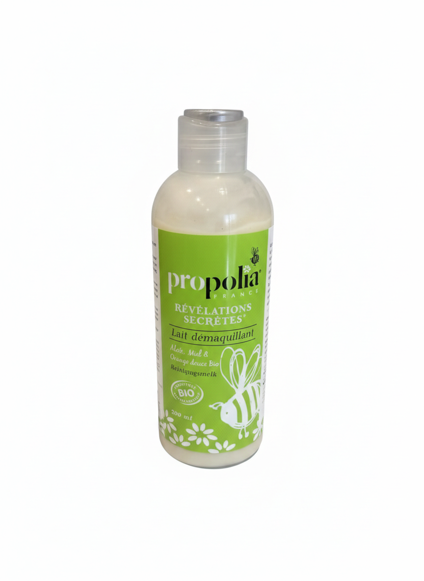 Aloès, Miel & Orange douce bio.Goûtez à la gourmandise d un lait démaquillant à la douce odeur de l'Orange ! Idéal pour tous les types de peau, le Lait Démaquillant Propolia élimine en douceur le maquillage et les impuretés accumulées au cours de la journée, sans laisser de film gras.