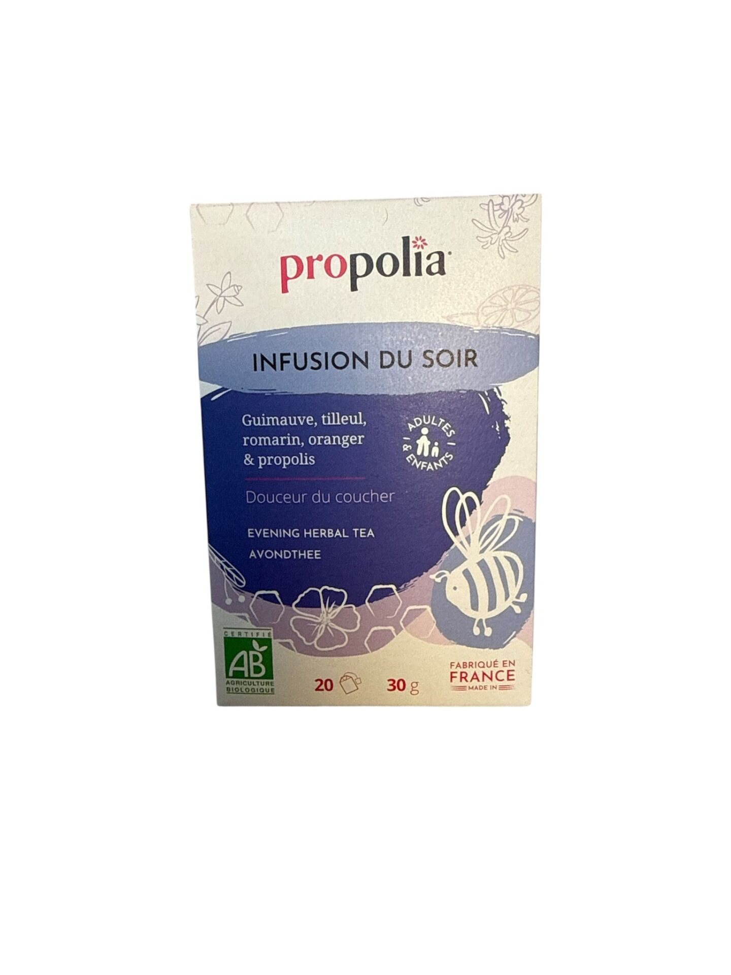 Guimauve, Tilleul, Romarin, Oranger & Propolis Douceur au coucher.. Adultes & EnfantsInfusions du soir bio propolis & plantes